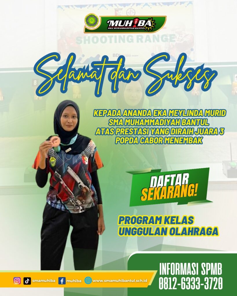 Salah satu siswa berprestasi dibidang olahraga turut maju bertanding dalam ajang kompetisi ini. Alhamdulilah Selamat dan Sukses Ananda Eka Meylinda Murid SMA Muhamamdiyah Bantul Juara 3 Cabang Olahraga Menembak. Ananda Eka Meylinda, merupakan murid berprestasi dari SMA Muhammadiyah Bantul, berhasil meraih kesuksesan gemilang dengan meraih 3 kejuaraan cabang olahraga menembak dalam ajang POPKAB dan kembali berprestasi di kompetisi POPDA. Pencapaian luar biasa ini diraih Meylinda setelah menunjukkan konsistensi, ketenangan, dan akurasi tinggi dalam serangkaian pertandingan. Keberhasilan ini tidak hanya mengharumkan nama sekolah, tetapi juga menjadi bukti pembinaan bakat murid di SMA Muhammadiyah Bantul berjalan dengan baik. Yuk bergabung dengan SMA Muhammadiyah Bantul ! Yuk segera daftar dan bergabung dengan KKO SMA Muhammadiyah Bantul , 081263333720 atau klik langsung https://www.smamuhibantul.sch.id/daftar-online/.